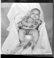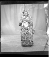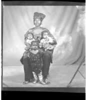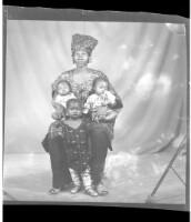 Copy of full portrait of four people, a woman sitting wearing a camisole, a black headscarf, and a black loincloth skirt, with two babies and a little girl standing wearing a black boubou and pants, facing forward