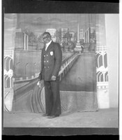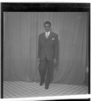 Full portrait of two men, one standing wearing a long sleeve shirt and a white bonne, to the right the other young man sits on a motor bicycle, facing forward
