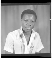 Copy of a full portrait of six people, a family photograph, to the left a woman sitting wearing a white boubou and a white headscarf, with a baby, in the middle two children standing, to the right a man sitting wearing a white and black boubou, with a lit