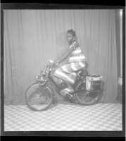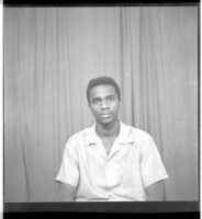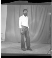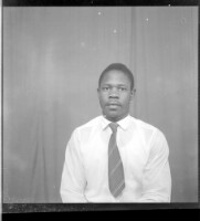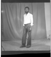 Full portrait of three people, two young men standing, to the left one wears a white shirt and black pants, in the middle a man wears a white shirt and a suit, and a young girl sits wearing a camisole, a loincloth skirt, and a headscarf, arms crossed, fac