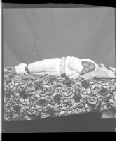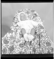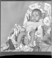 Full portrait of a couple, a woman sitting wearing a white boubou, a headscarf, and a baby, to the right a man sits, wearing a white boubou, facing forward