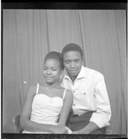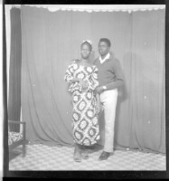 657. EAP449/2/22/657 Reference (shelfmark): EAP449/2/22/657 Title: Full portrait of a couple, a woman standing wearing a camisole, a full length loincloth skirt and a headscarf, with a man standing wearing a black t-shirt, a watch and pants, facing sideways Collection Area: Endangered Archives Programme Languages: Not applicable Date Range: 2nd half od the 20th century Extent: 1 TIFF image