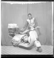 658. EAP449/2/22/658 Reference (shelfmark): EAP449/2/22/658 Title: Copy of a full portrait of a man standing holding his Vespa with baggage, facing forward Collection Area: Endangered Archives Programme Languages: Not applicable Date Range: 2nd half od the 20th century Extent: 1 TIFF image