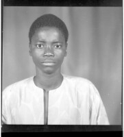 Full portrait of three men standing, to the left a man wears a shirt with three pockets and pants, in the middle a man wears a bassin boubou, sitting, to the right a man wears a black boubou, facing forward