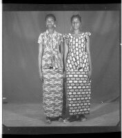 Full length portrait of two women standing, to the left a woman wears a black and white dress and a hairstyle, to the right the other woman wears a black dress and hairstyle, facing forward