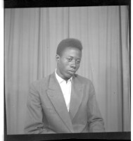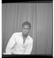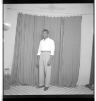 138. EAP449/2/23/138 Reference (shelfmark): EAP449/2/23/138 Title: A man wearing a shirt and pants standing in profile in the studio. Collection Area: Endangered Archives Programme Languages: Not applicable Date Range: 2nd half od the 20th century Extent: 1 TIFF image