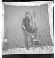 142. EAP449/2/23/142 Reference (shelfmark): EAP449/2/23/142 Title: A man wearing a shirt and pants posing with his foot on a chair, standing in profile in the studio. Collection Area: Endangered Archives Programme Languages: Not applicable Date Range: 2nd half od the 20th century Extent: 1 TIFF image