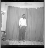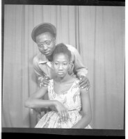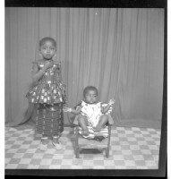A little girl wearing a dress, pagne, and necklace standing face-forward next to another wearing a dress sitting face-forward on a chair in the studio.
