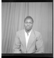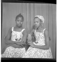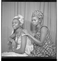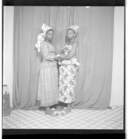 A woman wearing a dress, head wrap, and necklace next to a man wearing a boubou and head wrap, both holding a child on their laps and sitting face-forward; by their sides are two little boys standing, one face-forward and the other in profile, each in fro
