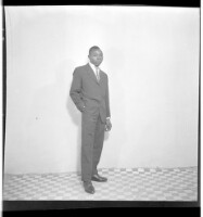 191. EAP449/2/23/191 Reference (shelfmark): EAP449/2/23/191 Title: A man wearing a suit and tie standing in profile in the studio. Collection Area: Endangered Archives Programme Languages: Not applicable Date Range: 2nd half od the 20th century Extent: 1 TIFF image
