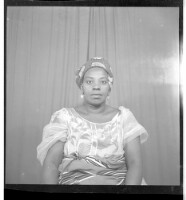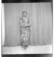 221. EAP449/2/23/221 Reference (shelfmark): EAP449/2/23/221 Title: A woman wearing a dress, pagne, head wrap, and necklace standing in profile in the studio. Collection Area: Endangered Archives Programme Languages: Not applicable Date Range: 2nd half od the 20th century Extent: 1 TIFF image