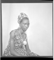 227. EAP449/2/23/227 Reference (shelfmark): EAP449/2/23/227 Title: A woman wearing a dress and head wrap sitting face-forward in the studio. Collection Area: Endangered Archives Programme Languages: Not applicable Date Range: 2nd half od the 20th century Extent: 1 TIFF image