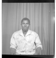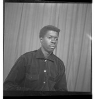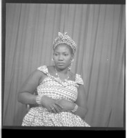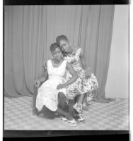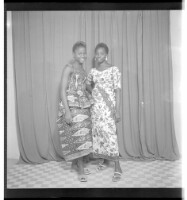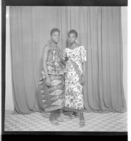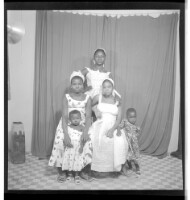 Three girls wearing dresses and head wraps, of whom two are sitting - one face-forward and the other in profile - and the third standing face-forward, accompanied by two other little girls in the studio.