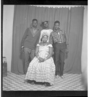 A woman wearing a dress, head wrap, and necklace sitting face-forward in front of three boys wearing shirts and pants, one wearing a hat, all standing face-forward in the studio.