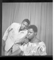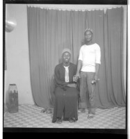 285. EAP449/2/23/285 Reference (shelfmark): EAP449/2/23/285 Title: A man wearing a shirt next to a girl wearing a dress, head wrap, and necklace sitting in profile in the studio. Collection Area: Endangered Archives Programme Languages: Not applicable Date Range: 2nd half od the 20th century Extent: 1 TIFF image