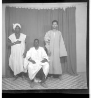 286. EAP449/2/23/286 Reference (shelfmark): EAP449/2/23/286 Title: Three men wearing boubous, one also wearing a head wrap; one sitting face-forward in between the other two standing face-forward in the studio. Collection Area: Endangered Archives Programme Languages: Not applicable Date Range: 2nd half od the 20th century Extent: 1 TIFF image