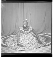 26. EAP449/2/23/26 Reference (shelfmark): EAP449/2/23/26 Title: A woman wearing a dress, head wrap, and necklace sitting in profile in the studio. Collection Area: Endangered Archives Programme Languages: Not applicable Date Range: 2nd half od the 20th century Extent: 1 TIFF image
