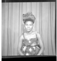 299. EAP449/2/23/299 Reference (shelfmark): EAP449/2/23/299 Title: A woman wearing a dress, head wrap, and necklace sitting face-forward in the studio. Collection Area: Endangered Archives Programme Languages: Not applicable Date Range: 2nd half od the 20th century Extent: 1 TIFF image