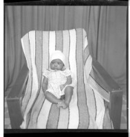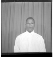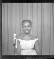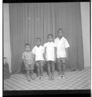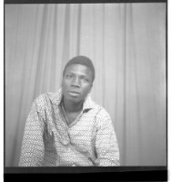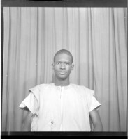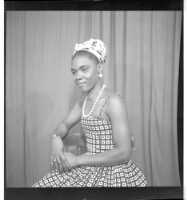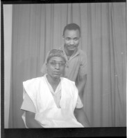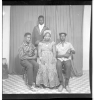 A woman wearing a dress, head wrap, and necklace sitting face-forward in between two men wearing shirts and pants, one wearing a beret and sitting face-forward and the other sitting in profile, all in front of another man wearing a shirt and tie standing