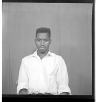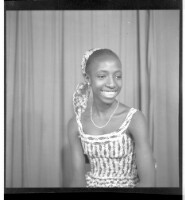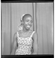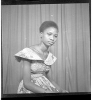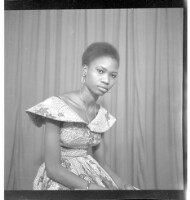 Two children standing face-forward in front of a woman wearing a dress and head wrap, holding a baby on her lap next to a man wearing a military uniform, all sitting face-forward with a little girl standing face-forward beside them; all in front of anothe