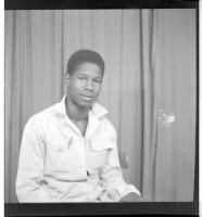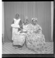A man wearing a boubou and hat holding a little boy on his lap and sitting in profile next to a woman wearing a dress and head wrap holding a little boy on her lap and sitting face-forward in the studio.