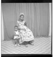 333. EAP449/2/23/333 Reference (shelfmark): EAP449/2/23/333 Title: A woman wearing a dress and head wrap sitting in profile with a child standing face-forward by her side in the studio. Collection Area: Endangered Archives Programme Languages: Not applicable Date Range: 2nd half od the 20th century Extent: 1 TIFF image