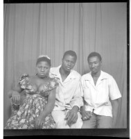 339. EAP449/2/23/339 Reference (shelfmark): EAP449/2/23/339 Title: Two men wearing shirts and pants sitting in profile next to a woman wearing a dress and head wrap sitting face-forward in the studio. Collection Area: Endangered Archives Programme Languages: Not applicable Date Range: 2nd half od the 20th century Extent: 1 TIFF image