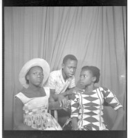 345. EAP449/2/23/345 Reference (shelfmark): EAP449/2/23/345 Title: Two girls wearing dresses, one wearing a hat, both sitting in profile in front of a boy wearing a shirt bending over in profile in the studio. Collection Area: Endangered Archives Programme Languages: Not applicable Date Range: 2nd half od the 20th century Extent: 1 TIFF image