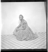 352. EAP449/2/23/352 Reference (shelfmark): EAP449/2/23/352 Title: A girl wearing a dress, head wrap, and necklace crouching down in profile in the studio. Collection Area: Endangered Archives Programme Languages: Not applicable Date Range: 2nd half od the 20th century Extent: 1 TIFF image