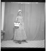 355. EAP449/2/23/355 Reference (shelfmark): EAP449/2/23/355 Title: A woman wearing a dress, head wrap, and necklace holding a handbag and standing in profile in the studio. Collection Area: Endangered Archives Programme Languages: Not applicable Date Range: 2nd half od the 20th century Extent: 1 TIFF image