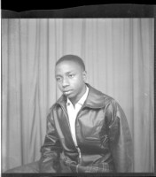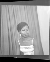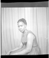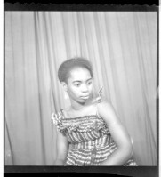 Full portrait of four young men and women kneeling, to the left a young man wears a grey and white shirt, and a young girl wearing a black and white dress and a necklace, in the middle a young girl wearing a dress and earrings, and a young man wearing a g