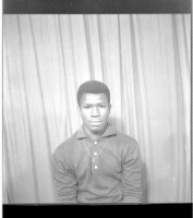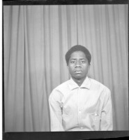 Full portrait of two young men, to the left one wears a white and black shirt and a paper in hand, to the right the other man wears a white shirt and black pants, their feet on an empty chair in the middle, facing forward