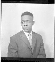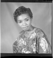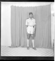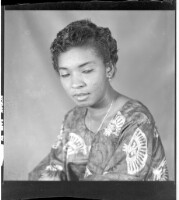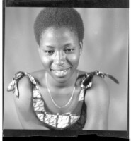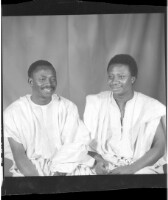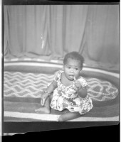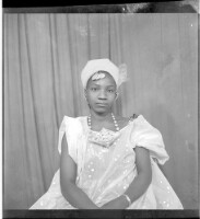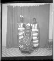 Full portrait of three young girls, two standing wearing camisoles and loincloth skirts, to the left one wears a white headscarf and to the right the other wears a necklace, in the middle a young girl is sitting, wears a dress and a white headscarf, facin