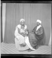 Full portrait of three people, a woman sitting on a chair wearing a white boubou and a white headscarf, with a baby and a man, wearing a white and black boubou, a black headscarf, and glasses, legs crossed and facing forward