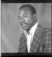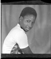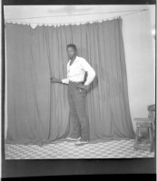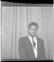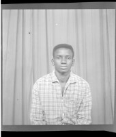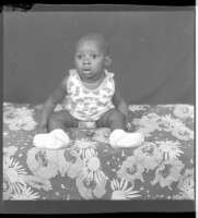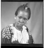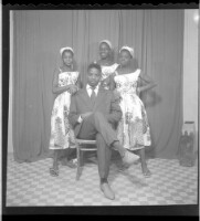 Full portrait of four people, three young girls standing dressed the same, wearing dresses and headscarves, and a man sitting wearing a white shirt and a black suit, facing forward