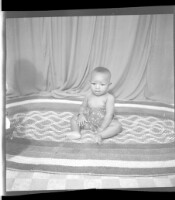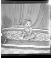 393. EAP449/2/23/393 Reference (shelfmark): EAP449/2/23/393 Title: Full portrait of a baby sitting on a rug, wearing black undershorts, facing forward Collection Area: Endangered Archives Programme Languages: Not applicable Date Range: 2nd half od the 20th century Extent: 1 TIFF image