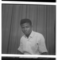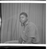 Copy of a full portrait of two people, to the left a young man kneeling, wearing a white short sleeve shirt and pants, and a little boy standing, wearing all black, facing forward