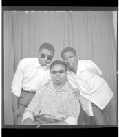 Three young men, one sitting wearing a grey shirt and glasses, two young men standing wearing white shirts, to the left, one wears black glasses, facing sideways