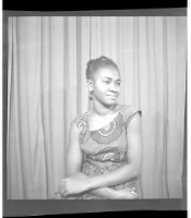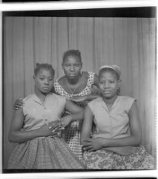 Three young girls, two sitting wearing grey shirts and skirts, to the right one wears a headscarf, both have their arms folded, and in the middle a young girl is standing wearing a dress, a necklace, and earrings, facing forward