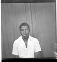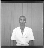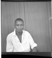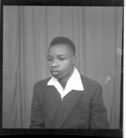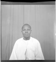 A full shot of five people; on the far right two men standing wearing white shirts, black pants, and glasses, with a young girl wearing a grey dress, head wrap, and earrings and two other men on the far left wearing shirts and black pants, one with a watc