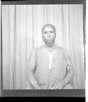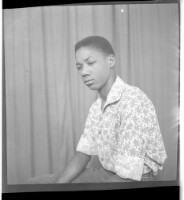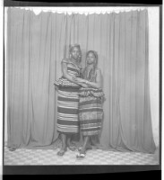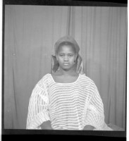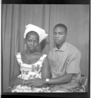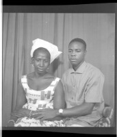 A woman wearing a camisole, pagne, and white head wrap sitting with a man wearing a grey shirt, white pants, and a watch, both face-forward in the studio.
