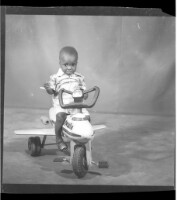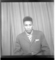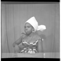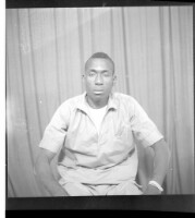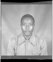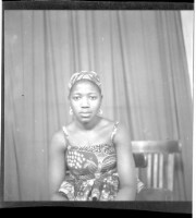 Two men sitting, the one on the right wearing a black boubou and a black fez and the one on the left wearing a white boubou, and a third man wearing a black boubou and black fez standing, all face-forward in the studio.