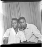 Two young men sitting, the one on the right wearing a white shirt and the one on the left wearing a blue and white long-sleeved shirt, both face-forward in the studio.