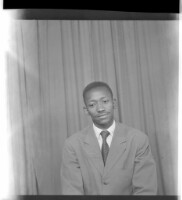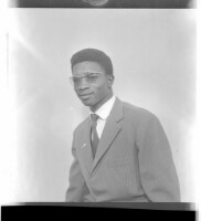 Three young men wearing shirts and pants, the one on the right holding a cigarette in his hand and the one in the middle smoking a cigarette, all standing face-forward in the studio.