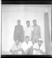 Six young men, three standing and 3 crouching on their knees, all wearing shirts and pants, the one on the left also wearing a hat and white shirt, all in profile in the studio.