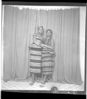 Two young girls wearing matching camisoles, black pagnes, necklaces, head wraps, and earrings holding each other and standing face-forward in the studio.