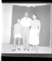 A little boy wearing a shirt, white shorts, and black shoes, a man wearing a white shirt and pants, and a woman wearing a grey t-shirt, white skirt, and a necklace with her hair styled, all standing face-forward in the studio.
