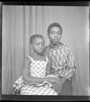 Two men sitting, the one on the right wearing a white and grey boubou, a hat, and holding a guitar and the one on the left wearing a black pagne, with two women wearing dresses and head wraps standing, and a little girl also standing, all face-forward in