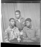 Two men standing, the one on the right wearing a grey boubou and the one on the left wearing a white boubou and black fez standing face-forward in the studio.