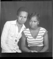 601. EAP449/2/23/601 Reference (shelfmark): EAP449/2/23/601 Title: A young girl wearing a t-shirt and earrings with her hair styled sitting with a young man wearing a long-sleeved shirt, both face-forward in the studio. Collection Area: Endangered Archives Programme Languages: Not applicable Date Range: 2nd half od the 20th century Extent: 1 TIFF image